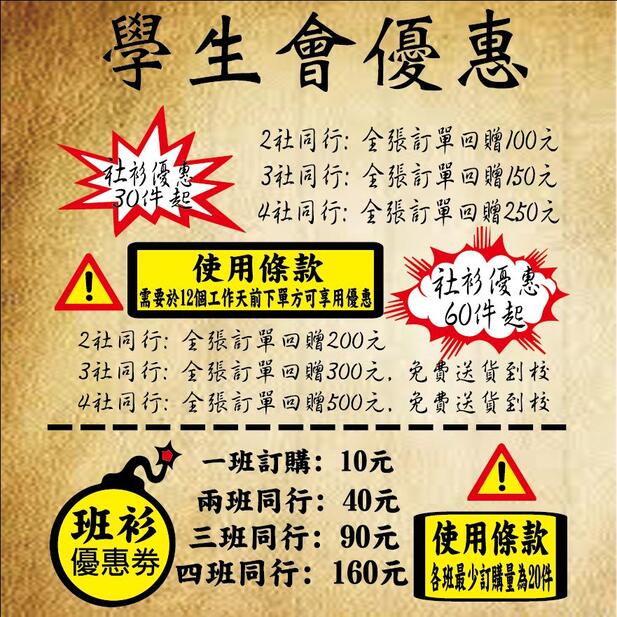 TT PRINTING 一直致力推廣與學生組織的合作計劃,每年均與多間的中學學生會合作提供不同學生優惠價錢,其中讓同學最受惠的是印製班衫及社衫的優惠。同學除了可以即時享受訂造社衫或班衫的優惠價錢外,更可以有機會透過集體訂購,獲得進一步的免費送貨,以及物資贊助的優惠,讓校園活動更多姿多彩。立即以最優惠的價錢,訂製班tee啦!